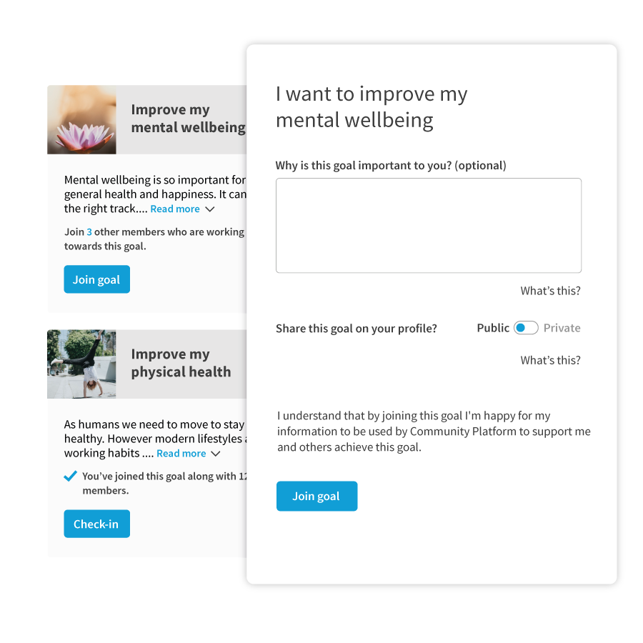 This feature helps members stay on track by responding to clear goal statements and accessing targeted resources. They can monitor progress with regular check-ins, receive prompts triggered by low scores and stay motivated with personalised support.